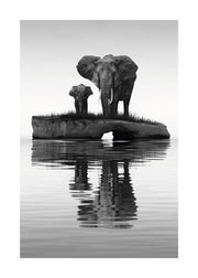 Fotoplakat af elefanter. På plakaten ses et sort/hvid motiv af to elefanter, en voksen og et barn, hvis refleksion ses i vandet omkring dem. Plakaten vil fungere fint i sammensætning med en af vores andre fotoportrætplakater eller andre fotoplakater af dyremotiver.