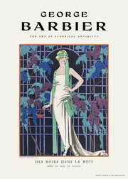 Kunstplakat af illustratoren George Barbier. George Barbier, var en af de store franske illustratorer i det tidlige 20. århundrede. Barbier var29 år, da han monterede sin første udstilling i 1911 og blev derefter fejet til spidsen for sit erhverv med opgaver om at designe teater- og balletkostumer, for at illustrere bøger og producere haute couture mode illustrationer. Denne plakat er kaldet "Des roses dans la nuit" og er fra 1921.