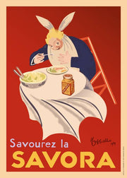 Vintage retroplakat for Savora af Leonetto Cappiello. Leonetto Cappiello var en italiensk og fransk plakatkunstdesigner og maler, der hovedsageligt boede og arbejdede i Paris. Han kaldes nu ofte 'faren til moderne reklame' på grund af sin innovation inden for plakatdesign.