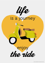 Super sød og fin tekstplakat. På denne plakat står teksten "Life is a journey enjoy the ride", med en scooter og et gult hjerte.