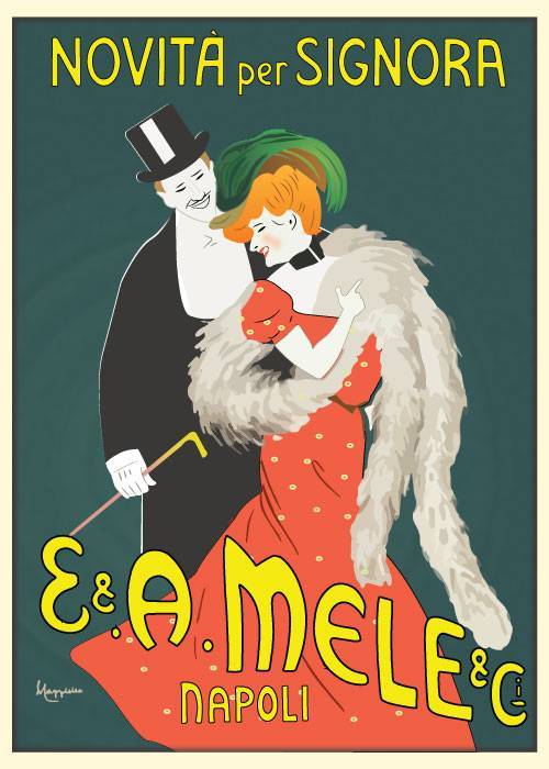 Vintage Leonetto Cappiello plakat fra 1903. Cappiello designede fire plakater til Mele, det napolitanske stormagasin, og han trak tydeligvis alle stoppestederne ud for at skabe de mest elegante og moderigtige billeder af tiden. Mele var den største konto for Ricordi, den banebrydende milanesiske litografiske printer. Siden 1896 satte Ricordi sine allerbedste kunstnere til at arbejde for detailkraftværket. Ved hjælp af billeder i stort format bragte Mele elegancen og spændingen i det høje samfund før krigen til en ivrig og voksende italiensk borgerlig klasse.