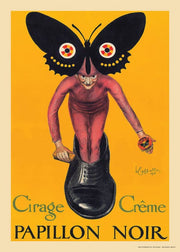 Vintage Leonetto Cappiello reklameplakat for skosværte. På plakaten står der "Black Butterfly" skosværte. Alfen med den bevingede hovedbeklædning ser ud, som om han kunne flagre væk når som helst.