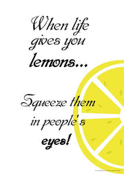 Super sjov tekstplakat med et sjovt pun "When life gives you lemons… squeeze them in people's eyes!". Plakaten er humoristisk og ville være perfekt i ethvert køkken.