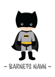 Børneplakat af en dreng klædt som superhelten Batman.. Denne plakat vil fungere fint i sammensætning med de andre SUPERHERO plakater og/eller med andre lignende plakater på et børneværelse. Plakaten vil også være en fantastisk gave og kan forøvrigt personaliseres for kun 19 kr. ekstra.