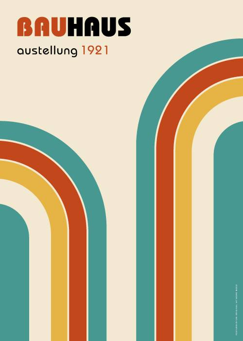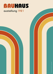 Bauhaus plakat. Udstillings- kunstplakat fra en Bauhaus udstilling fra 1921. Bauhaus er en forkortelse for navnet for Staatliches Bauhaus, en tysk højskole for design og anvendt arkitektur som eksisterede fra 1919 til den blev lukket efter pres fra nazisterne i 1933. Weimar udstillingen, der for første gang blev afholdt i 1923, var den første store Bauhaus udstilling, som skolen afholdte. Udstillingen formål var at fremvise skolens nye stil. Dette er en Bauhaus bestseller med to regnbuer ved siden af hinanden.