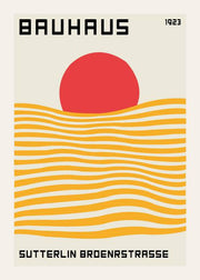 Bauhaus plakat. Udstillings- kunstplakat fra en Bauhaus udstilling fra 1923. Bauhaus er en forkortelse for navnet for Staatliches Bauhaus, en tysk højskole for design og anvendt arkitektur som eksisterede fra 1919 til den blev lukket efter pres fra nazisterne i 1933. Weimar udstillingen, der for første gang blev afholdt i 1923, var den første store Bauhaus udstilling, som skolen afholdte. Udstillingen formål var at fremvise skolens nye stil. På denne plakat ses en rød sol og gul hav, der skal forestille en solnedgang.