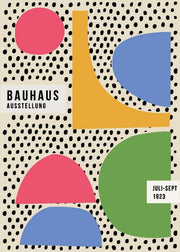 Bauhaus plakat. Udstillings- kunstplakat fra en Bauhaus udstilling fra 1923. Bauhaus er en forkortelse for navnet for Staatliches Bauhaus, en tysk højskole for design og anvendt arkitektur som eksisterede fra 1919 til den blev lukket efter pres fra nazisterne i 1933. Weimar udstillingen, der for første gang blev afholdt i 1923, var den første store Bauhaus udstilling, som skolen afholdte. Udstillingen formål var at fremvise skolens nye stil. På denne plakat ses en masse forskellige farvet elementer, op af en sort prikket baggrund.