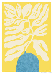 Original Postershop kunstplakat. Denne plakat er en del af Postershops nye kunstkollektion. På plakaten ses et unikt motiv, der illustrere en hvid blomst der blomstre omkring en gul baggrund. På plakaten ses der også en blå vase, hvilket er fokuspunkt for plakaten. Plakaten er super enkel og minimalistisk.