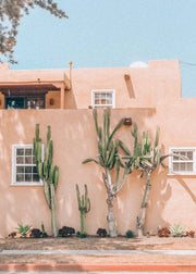 Fotoplakat af kaktusser foran en bygning. Plakaten vil fungere fint i sammensætning med andre fotoplakater fra samme kategori eller i kollage med plakater i samme farveskala.