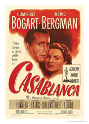Vintage filmplakat fra den berømte film Casablanca. På plakaten ses de to hovedroller i fokus, med tekst omkring skuespillerne og filmens navn med røde blokbogstaver.