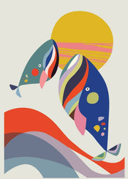På denne sjove plakat, ses to fisk der springer op mod solen. Denne plakat leger med mange elementer, himmel, jord & vand og lys. Plakatens farver, passer perfekt til sommeren og vil være perfekt i en hver stue.