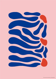 Original Postershop galleriplakat. Denne plakat er en del af Postershops nye gallerikollektion. På plakaten er der illustreret fine abstrakte lange blå blomster, bestående af røde elementer omkring en fin lyserød baggrund. Plakaten er super unik samt minimalistisk.