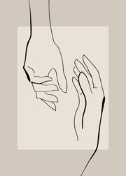 Fin grafisk plakat af hænder. På plakaten ses en stregtegning af to hænder op af en beige/brunlig baggrund. Plakaten er enkel og minimalistisk, men bære unikke og abstrakte træk..