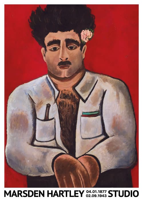 Kunstplakat inspireret af den eftertragtede maler Marsden Hartley. Marsden Hartley var en amerikansk maler; han regnes for én af de mest profilerede af klassisk moderne malere i USA. Selv om Marsden Hartley kaldes for "Amerikas første store moderne maler i det 20 århundrede", har hans fascinerende skæbne, originale værk og rolle i kunsthistorien længe være overset. Amerikanske Marsden Hartley (1877-1943) var både maler og digter, og hans værk kan betragtes som en bro mellem europæisk og amerikansk modernisme. Hartley levede store dele af sit liv som nomade mellem Europa og USA, og disse rejser mundede ud i række dybt originale værkgrupper fra 1906 til 1943. Blandt disse tæller en serie abstrakte malerier skabt med udgangspunkt i militærsymboler fra Første Verdenskrigs rædsler, mennesketomme, næsten surreelle landskaber fra New Mexico og feminiserede figurmalerier af muskuløse arbejdsmænd.