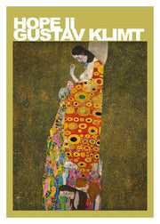 Kunstplakat af Gustav Klimt. Hope II er et maleri af Gustav Klimt, lavet i 1907–08. Det var det andet af Klimts værker, der fokuserede på en gravid kvinde, der begge skildrer Herma, en af ​​hans yndlingsmodeller. Det havde titlen Vision af Klimt, men er blevet kendt som Hope II efter det tidligere værk Hope, der nu udmærker sig som Hope I. Gustav Klimt var en østrigsk maler, hvis værker er præget af en stiliseret, dekorativ udtryksform med symbolistiske elementer af bl.a. kærligheden og døden. Disse temaer genfindes i mosaikfrisen, som han udførte til Josef Hoffmanns Palais Stoclet i Bruxelles. Shop flere Gustav Klim plakater som denne her! Tryk her for at shoppe vores andre kunstplakater