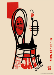 Reklameplakat for Monterey Jazz Festival. En grafisk komposition hvor en stiliseret stol smelter sammen med en trompet og danner et markant centralt motiv. Kraftige linjer og flade farvefelter skaber en klar visuel rytme, mens typografien bevæger sig dynamisk omkring formen - fra den store “JAZZ”-tekst nederst til den lodrette datomarkering i siden. Designet arbejder med stærke kontraster og enkel symbolik, der giver plakaten et direkte, næsten ikonisk udtryk. Formsproget ligger solidt i 1960’ernes modernistiske plakattradition med tydelig inspiration fra amerikansk mid-century grafisk design.