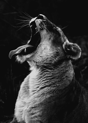 Sort-hvid fotoplakat af en løveinde der ses brøle. Løveinden står i kontrast med den sorte baggrund, hvilket skaber dimension i billedet. Plakaten vil fungere fint i sammensætning med en af vores andre løveplakater og eller andre fotoplakater af natur- og dyremotiver.