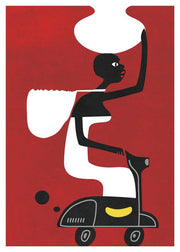Grafisk vintageinspireret kunstplakat af en kvinde på en scooter. Plakaten er unik, smuk, og vil passe godt i alle hjemmets rum, herunder soveværelset, stuen og køkkenet.