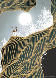 Original Postershop plakat. Denne plakat er en del af Postershops nye grafiske plakat kollektion. På plakaten ses et malet udsnit af en smuk guld hjort ovenpå en klippetop med gulddetaljer samt en lysende måne i baggrunden.