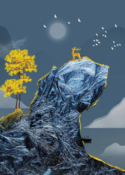 Original Postershop plakat. Denne plakat er en del af Postershops nye grafiske plakat kollektion. På plakaten ses et malet udsnit af en smuk guld hjort ovenpå et bjerg med gulddetaljer, med fugle og træer i baggrunden.