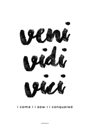 Tekstplakat med det berømte citat "Veni Vidi Vici", hvilket betyder "jeg kom, jeg så, jeg besejrede". Citatet afstamer fra det gamle Italien, og var tilskrevet den berømte Kejser Julius Cæsar.