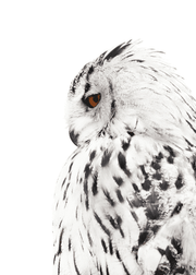 Fotoplakat af en ugle med hvide og sorte fjer. Plakaten vil fungere fint i sammensætning med en af vores andre fugleplakater eller andre fotoplakater af dyremotiver.