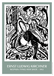 "Woman tying her shoe" kunstplakat fra 1912 af Ernst Ludwig Kirchner. Ernst Ludwig Kirchner var en tysk ekspressionistisk maler, grafiker og billedhugger. På trods af at han studerede arkitektur ved Königliche Technische Hochschule i Dresden, viede Kirchner sit liv til kunst. Kirchner var en af grundlæggerne af Broen (Die Brücke), en kunstnergruppe, der spillede en stor rolle i udviklingen af den ekspressionistiske bevægelse. Kirchner etablerede The Bridge med Fritz Bleyl, Erich Heckel og Karl Schmidt-Rottluff. Hans kunst blev stemplet som ensartet af nationalsocialisterne og mere end 600 af hans værker forsvandt fra tyske museer.