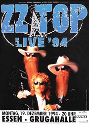 Vintage koncertplakat af ZZ Top. Denne plakat er fra en af deres 1994 koncerter. ZZ Top er et blues rock-band fra Houston, Texas dannet i slutningen af 1969. Gruppen består af Billy Gibbons, Dusty Hill, og Frank Beard. Dusty Hill gik bort d. 28. juli 2021. ZZ Top har indtil Hills død i 2021 ikke haft udskiftning af medlemmer i de mere end 50 år, bandet har eksisteret.